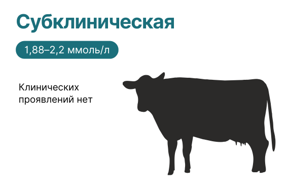 Субклиническая гипокальциемия характеризуется снижением уровня кальция в крови до 1,88 – 2,2 ммоль/л, при этом могут отсутствовать клинические симптомы.
