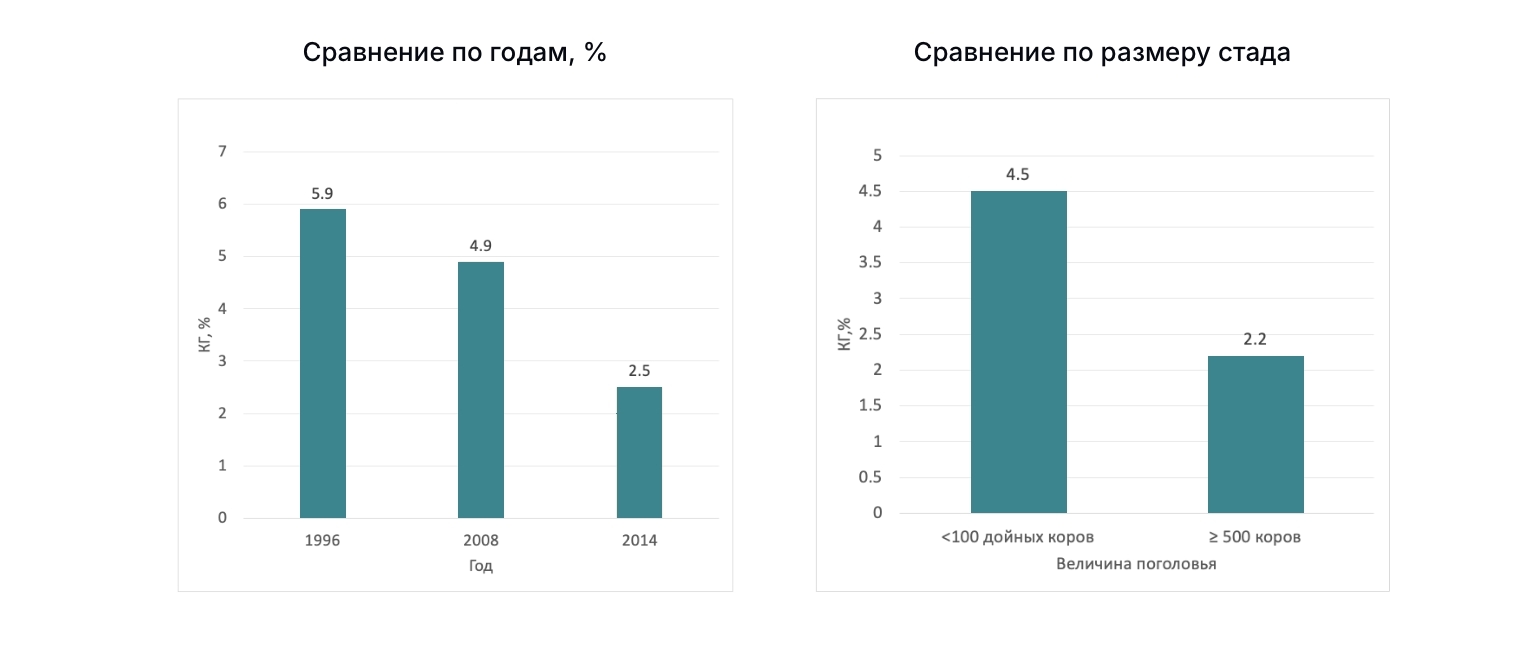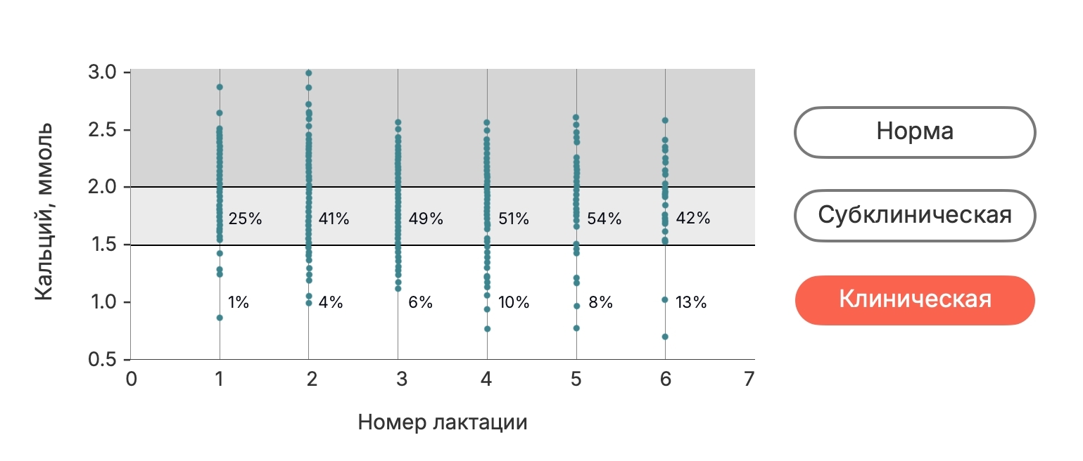 Анализ на общий кальций (tCa) наиболее корректно отражает негативные последствия для здоровья и продуктивности коров второй и последующих лактаций. Встречаемость гипокальциемии у коров 2+ отёла достигает 50%. Процент выбраковки по причине послеродового пареза — до 5%.